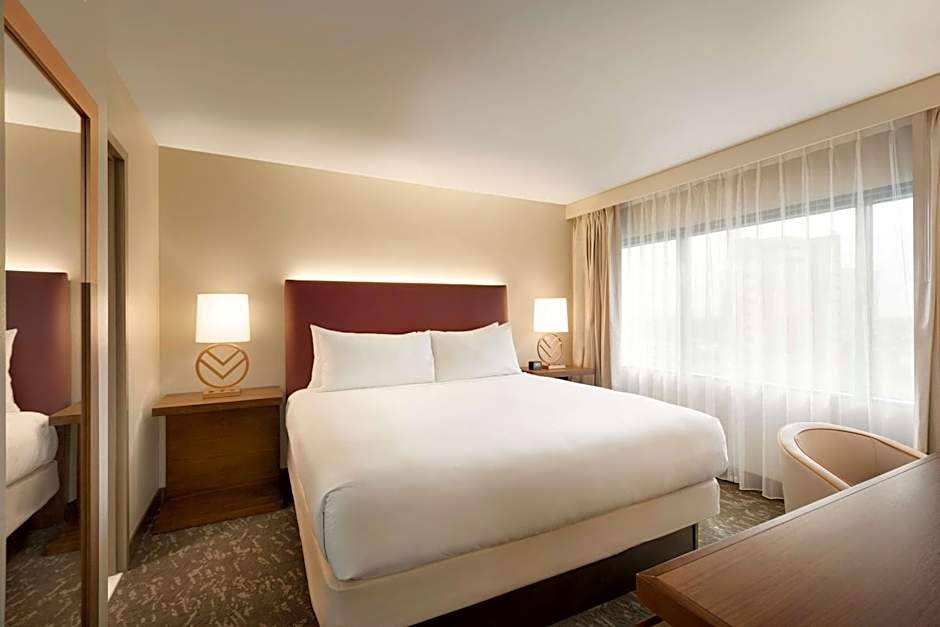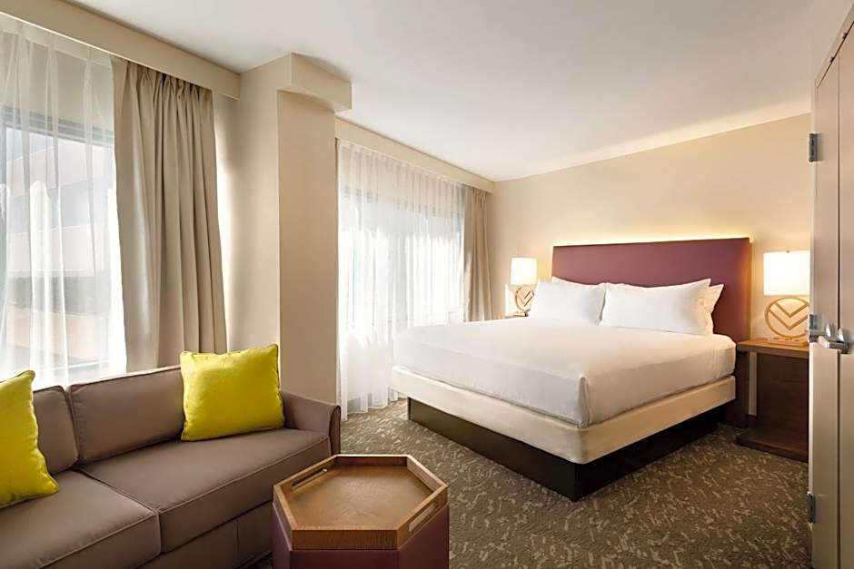 Relax in this 430 sq. ft. one-room studio with one king-sized bed or 2 queen beds plus sleeper sofa. Free made-to-order full breakfast and Evening Reception featuring beer, wine, premium spirits and light snacks. Other room amenities include a microwave, refrigerator, and 55-inch HDTV as well as a hairdryer, in-room safe, iron, and coffeemaker